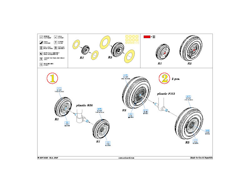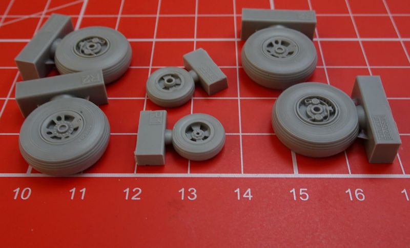 In der Tüte befinden sich sechs sauber gegossene Resinteile, ein Set gelbe Masken und die Bau- und Bemalungsanleitung. Die Räder sind tadellos detailliert und die Reifen haben ein Profil. Weiterhin sind sie leicht abgeplattet dargestellt. Das ist dezent und nicht übertrieben.