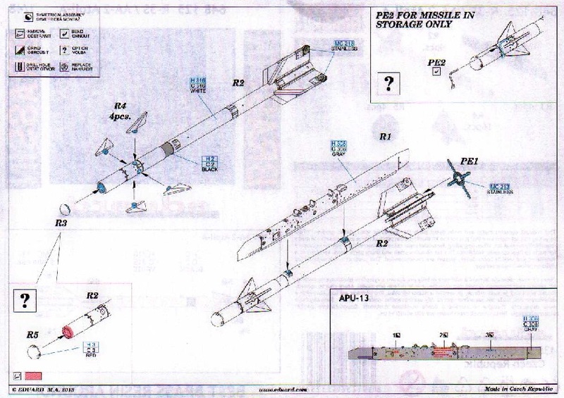 Der zweiteilige Aufbau des Flugkörper-Rumpfes erfordert etwas Aufmerksamkeit. Es gibt zwei verschiedene Waffenträger. Von den Steuerflächen liegen 5 Ersatzteile, ebenso wie ein Decalbogen bei.