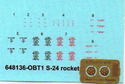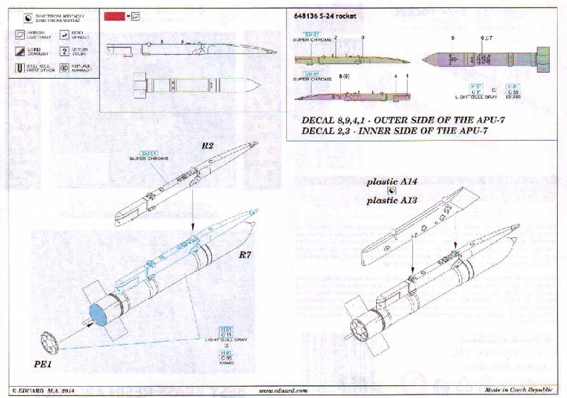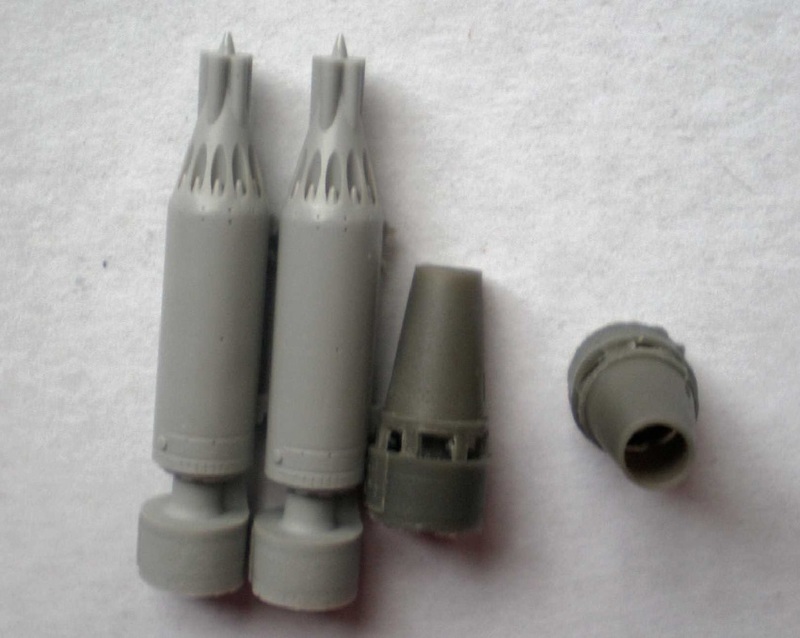 Die beiden S-24 Boden-Boden-Raketen liegen in einem Stück vor. Ergänzt mit Waffenträger, Decal und Ätzteil hat man hier eine eher ungebräuchliche MiG-21 Waffe zum Anhängen.