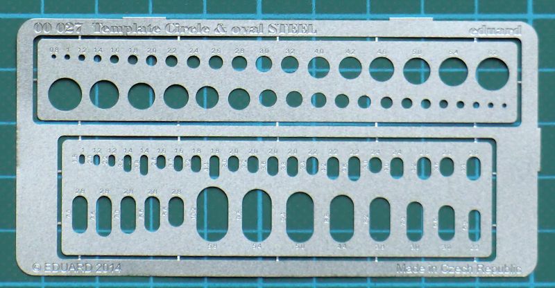 Als Hilfe zum nachgravieren von Deckel oder ähnliches hat eduard dieses Set herausgebracht. Es gibt bei den kreisrunden Vorlagen Durchmesser ab 1 bis 64 mm.