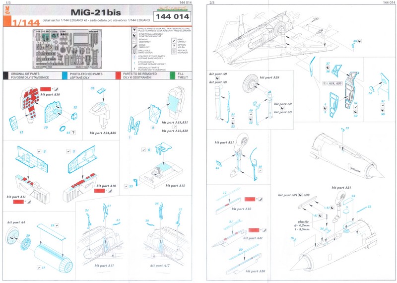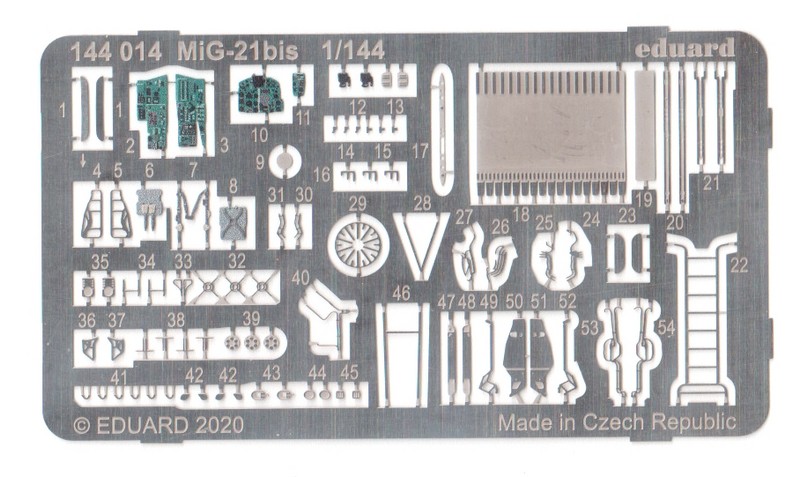 Passend zur Wiederauflage der MiG-21bis in 1/144 hat eduard auch einen passenden Ätzteilesatz auf den Markt gebracht. Dieser ist neu und löst damit den alten Satz unter der Katalognummer 144003 ab. Hauptunterschied ist neben einer anderen Gruppierung der Teile sicherlich die farbige Bedruckung einiger Teile z.B. für das Cockpit. Dafür fehlen die noch im alten Satz enthaltenen Chocks und Abdeckungen.