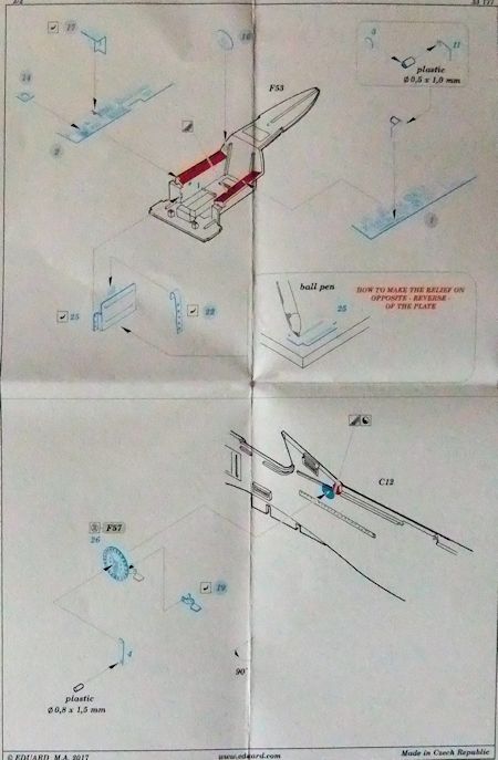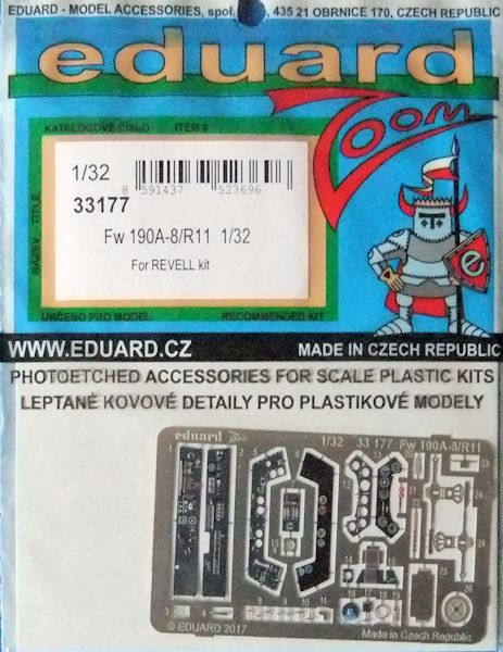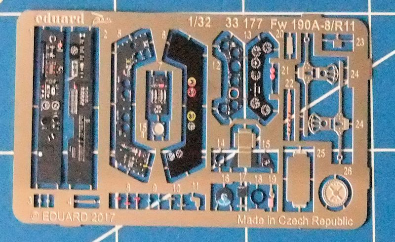 Das Set für den Nachtjäger Focke Wulf Fw 190A-8/R-11 besteht aus einer farbigen Platine die das Cockpit abdeckt. Es sind nur wenige Teile, Armaturenbrett, Seitenkonsolen usw. aber sie geben sicherlich einen realistischen Einblick in den Pilotenraum. Die kleine Anleitung ist klar und übersichtlich gezeichnet.