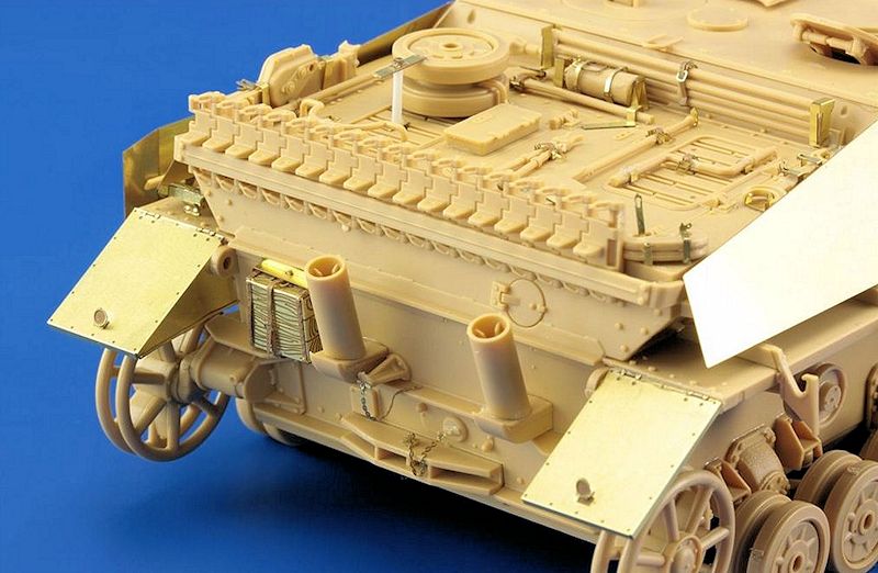 Anhand der dreiseitigen, wie immer sehr ausführlichen Bauanleitung, werden folgende Teile ergänzt oder ersetzt: Der Unterlegklotz für den Wagenheber (hierfür befindet sich ein extra strukturiertes Ätzteil mit angedeuteter Holzmaserung im Set), Details am Heck des Panzers, die vordere- und die hintere Abdeckung der Ketten, die Rohrhalterung, sämtliche Werkzeughalter, der Feuerlöscher und der Wagenheber, der vordere Bosch Tarnscheinwerfer, das hintere Tarnrücklicht, Details der Luken und die Halterungen der Ersatzlaufrollen.
