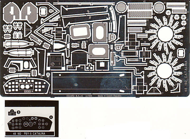 Heute möchte ich mal einen wirklich alten Satz für die PBY Catalina vorstellen. Als ich diesen Satz aus meinem Fundus gezogen habe, fühlte ich mich in die "gute alte Zeit" versetzt, als auf den Bögen noch hauptsächlich notwendige bzw. hilfreiche Details zu finden waren. Gleichzeitig fiel mir natürlich auf, wie weit sich Eduard auch bezüglich der Ätztechnik weiterentwickelt hat, denn die Details sind im Vergleich eher rudimentär. Natürlich vermisse ich auch die bereits bedruckten Instrumentenbretter und Gurte, doch dafür gibt es mit FE 599 auch einen Zoom Satz.