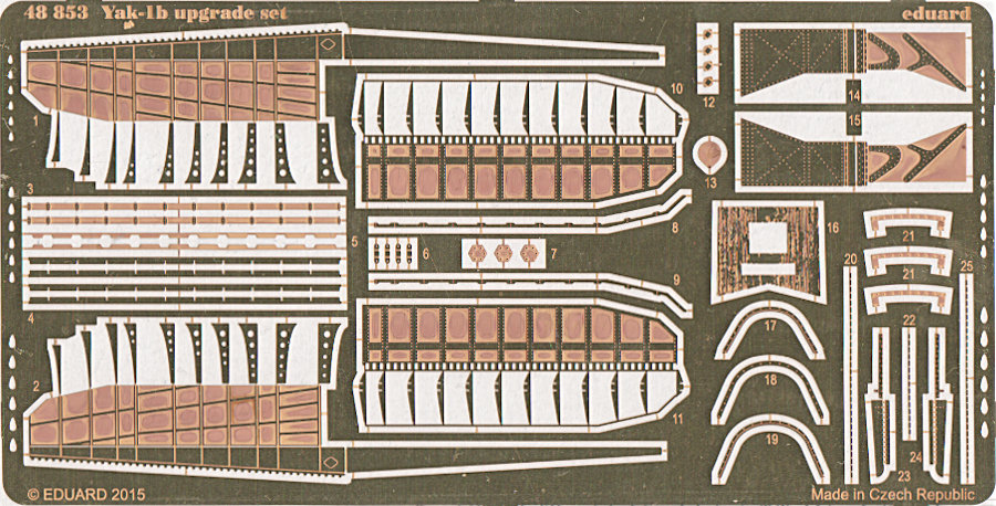 Für den eigenen Limited Edition Bausatz der Jak-1b hat Eduard dieses "upgrade set" herausgebracht. Inhaltlich ist dieses überschaubar. Es gibt die Landeklappen, Fahrwerksklappen für Hauptfahrwerk und Spornrad und ein paar Außendetails.