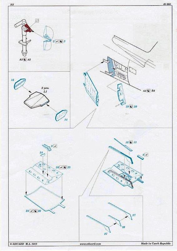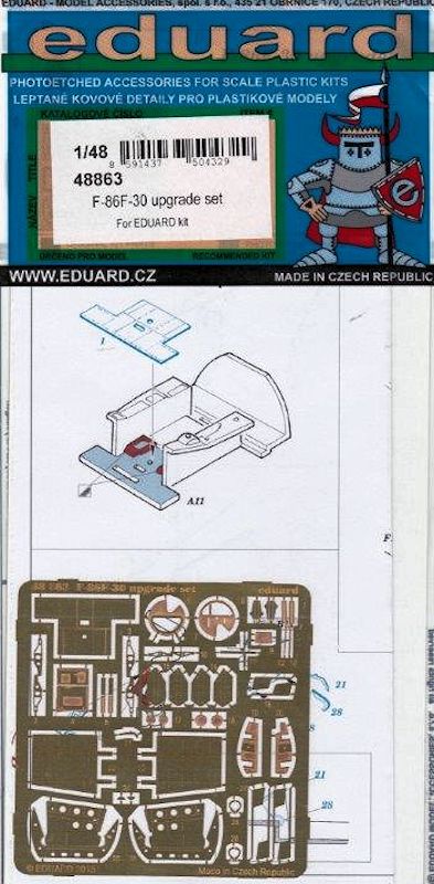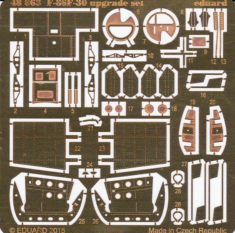 Bausatz: Für den in der Limited Edition Ultimate Sabre erschienen Bausatz (Bausatznr.1163) haben die Tschechen noch einen Ätzteilbogen zum weiteren Verfeinern des Bausatzes herausgebracht. Die Verpackung enthält eine Platine in Messingfarbe und die dazugehörige Bauanleitung. Mit der Ätzteilplatine kann der Bausatz in allen Bereichen aufgewertet werden: Vom Cockpit über Fahrwerk und der weiteren Detaillierung der Innenseiten der Airbrakes (Luftbremsen). Viele Teile gilt es nicht zu verbauen. Auch das biegen von Ätzteilen fällt sehr spärlich aus. So ist dieser Ätzteilsatz aufgrund seiner relativen einfachen Handhabung, auch vom Anfänger gut zu händeln.
