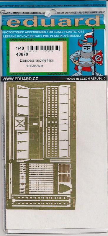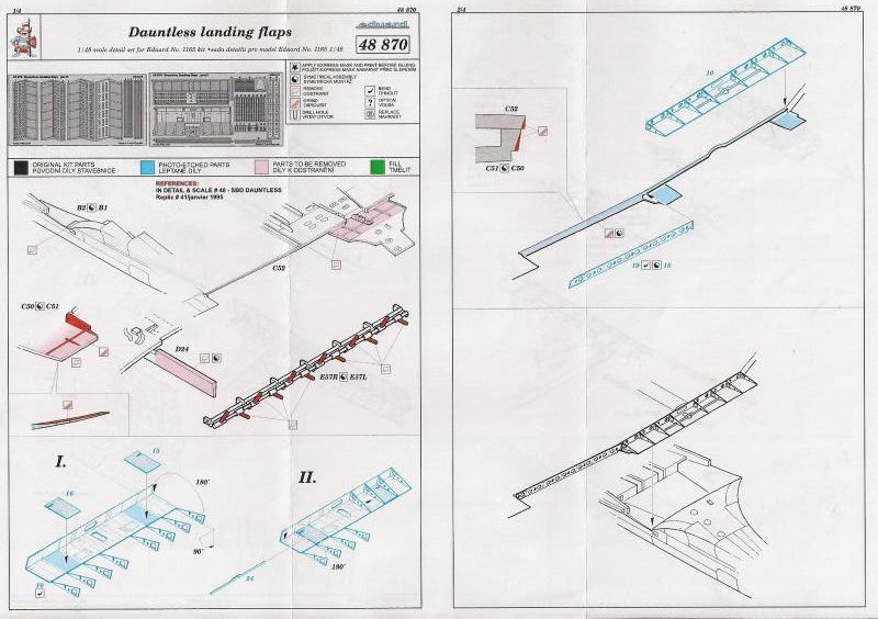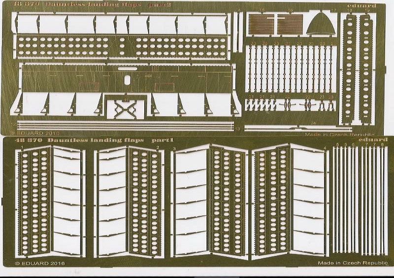Eduard produziert wie gewohnt zu seinem SBD-5 Dauntless-Kit weitere Zurüstteile. Dem Kit liegen bereits zwei Rahmen mit fotogeätzten Teilen zur Verfeinerung des Modells bei. Hier bietet Eduard nun zusätzlich die Möglichkeit an, auch die Sturzflugklappen (und um diese handelt es sich in Wirklichkeit, obwohl sie wohl auch als Landeklappen dienten) zu verfeinern. Obgleich der Kit bereits separate Klappen in Spritzguss enthält, ist trotzdem noch einiges Sägen und Feilen erforderlich, um die Ätzteile anzubringen. Außerdem sind zahlreiche Stangen und Kleinteile selbst zu anzufertigen und eine Unmenge kleiner Hebel und Führungsarme anzubringen. Hinzu kommt die Notwendigkeit, die großen Blechteile gleichzeitig in mehrere Richtungen zu biegen.