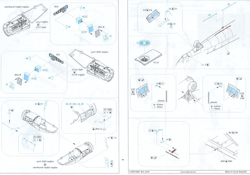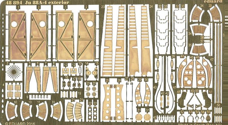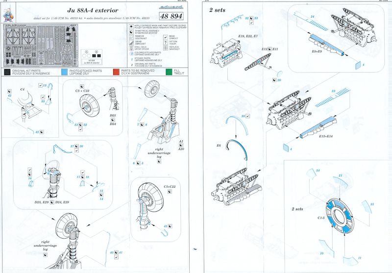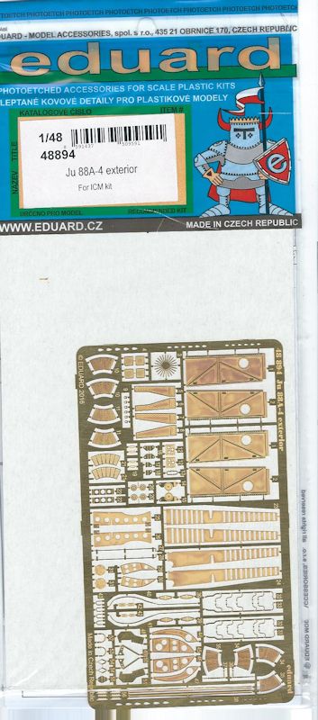 Eduard hat für die Ju-88-Reihe von ICM mehrere Ätzteilsets herausgebracht. Das Exterior-Set besteht aus einem messingfarbenen Bogen mit insgesamt ca. 60 Teilen und einem kleinen Actatfilm. Die vierseitige Bauanleitung führt durch den Einbau der zahlreichen Verbesserungen für Fahrwerk, Motor und Antennen. Gut gefallen mir z.B. die Zündkabel für die Jumos und die zahlreichen Bleche, Leitungen und Hebel an den Fahrwerksbeinen und Rädern. Ob man alles verbauen muss, ist sicher Ansichtssache.