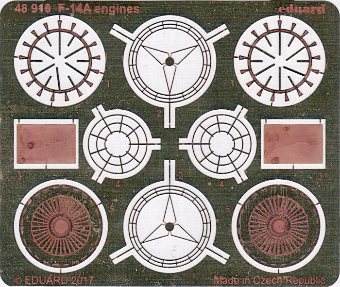 Für den Bausatz der F-14A von Tamiya (First Look) hat Eduard verschiedene Detail- und Zubehörsätze herausgebracht. Nicht alles davon ist wirklich nötig, denn der Grundbausatz von Tamiya ist wirklich gut gestaltet. Allerdings gibt es sicherlich viele unter uns Modellbauern, die einem Quäntchen mehr an Details nicht abgeneigt sind. Hier haben wir einen Satz, der wohl nur den abgehärteten Detailfreak ansprechen wird. Tief im Inneren der Schubdüsen finden sich die Triebwerke mit den Nachbrennern. Nur mit Lampe und Lupe kann man hier den Unterschied zu den Plastikteilen erkennen...