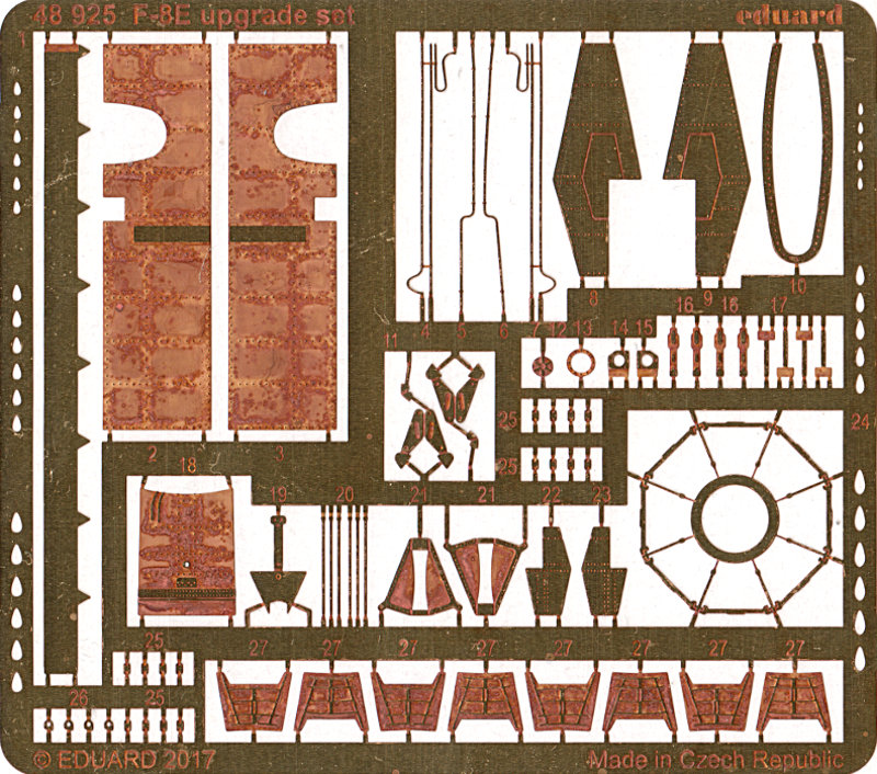 Dieser Satz dient vor allem der Außendetaillierung der Crusader. Ein nicht unerheblicher Teil der kleinen Platine wird für die Optimierung der Schubdüsen verwandt, was überflüssig ist, wenn man zur Resinschubdüse der Brassin-Linie greift. Die Frontscheibenumrandung hätte gut auch im Bausatz enthalten sein können. Aus der Zeichnung der Bauanleitung werde ich nicht so recht schlau, ob das von Außen oder Innen angebracht werden soll. Ein paar Details gibt es noch für die Zuni-Launcher und der Rest landet im und am Fahrwerk bzw. Fahrwerkschacht. Hier mal ein Blick in die Bauanleitung.