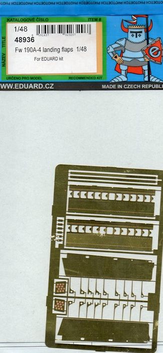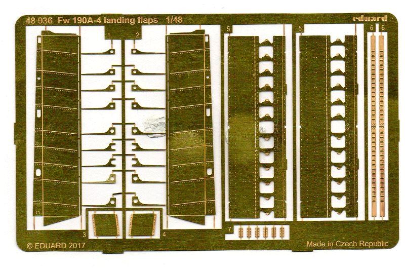 Eduard hat zur Aufwertung seines neuen Fw 190 A-4 -Bausatzes ein Ätzteilset für die Nachbildung der Landeklappen herausgebracht. Die rund 14 Teile sind auf einem messingfarbenen unlackierten Bogen enthalten und müssen dem Vorbild entsprechend zu zwei zarten dreidimensionalen Gebilden gefaltet bzw. geklebt werden. Vorher sind noch einige Sägearbeiten vor allem am Unterflügel durchzuführen.
