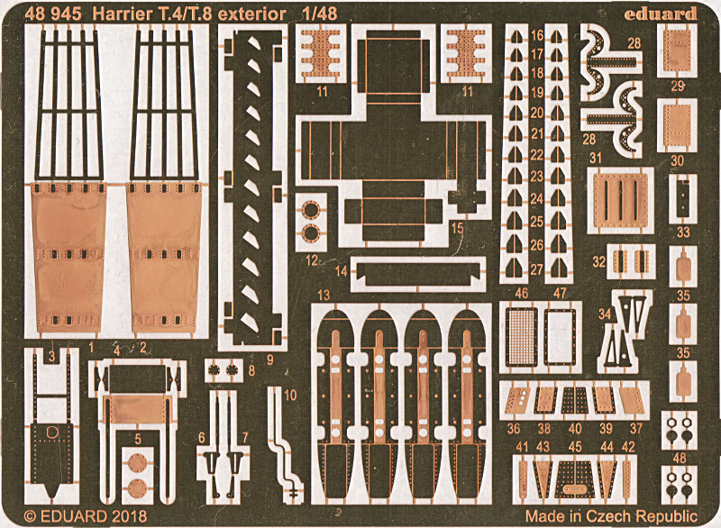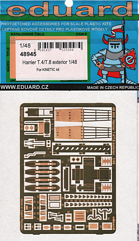Für den Bausatz der Trainervarianten des Hawker Siddeley Harrier von Kinetic (First Look) hat Eduard verschiedene Detail- und Zubehörsätze herausgebracht. Es ist derzeit bei Eduard üblich für das Cockpit zwei Sätze: zum einen den Zoom Satz, der nur die farbige Platine enthält und diesen Satz mit einer weiteren Platine für Details im und am Cockpit herauszubringen. Hinzu kommte oft noch ein Satz für die Optimierung des Äußeren des Bausatzes sowie die Sitzgurte. Aus wirtschaftlicher Sicht ist dies für Eduard nachvollziehbar, aber für den Modellbauer ärgerlich, weil die Sätze oft nicht sehr umfangreich sind und man einiges auf einer etwas größeren platine Zusamenfassen könnte.
