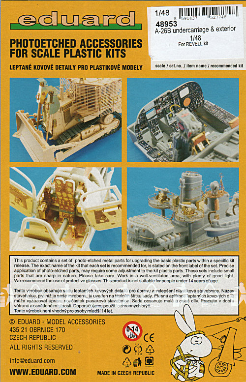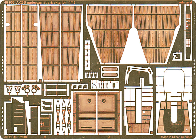 Für die kürzlich erschienene Wiederauflage des Revell/Monogram Bausatzes der A-26B (First Look) hat Eduard mehrere Detailsätze herausgebracht. Hier stelle ich Satz zur Auskleidung der Fahrwerkschächte vor. Dieser Bogen hat die Abmaße von ca. 14,5cm x 10cm.