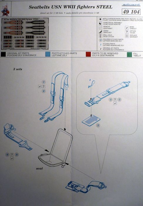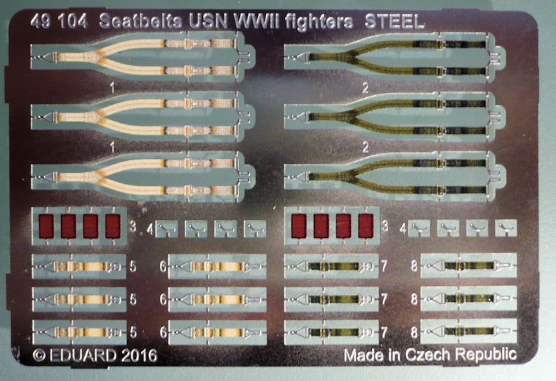 Dieses Set ist für Jagdflugzeuge der U.S. Navy während des zweiten Weltkrieges geeignet. Unterschiedliche Farbdrucke bieten die Darstellung leinenfarbiger bzw. dunkeloliv eingefärbter Gurte. Hier muss der Modellbauer eventuell recherchieren, welche Typ bei welchem Flugzeug verwendet wurde. Helles Leinen z.B. gab es oft in Jagdflugzeugen, die im Pazifik kämpften.