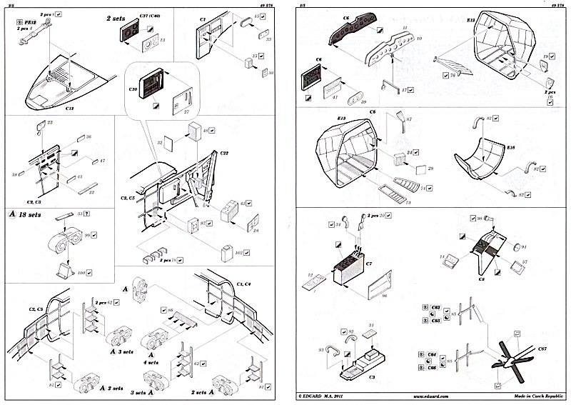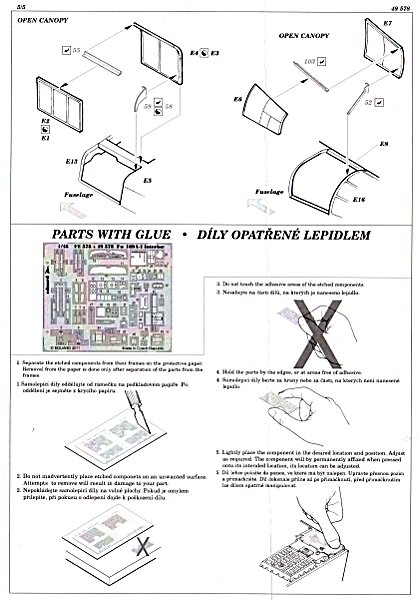 Für die MG 151/20 (vielleicht auch MG 151/15) gibt es 2 Munitionskisten und einen Gurt. Diese Kisten sind dieselben, die bei der A-2 Variante für das MG81Z eingebaut werden ... also irgendwie seltsam. Das MG 15 im Heck erhält einen neuen, perforierten Kühlmantel - allerdings muss dieser erst mal in eine runde Form gebracht werden - und Munitionstrommeln zum Selberfalten. Diese werde ich nicht verwenden, da ich die Plastikreplikas besser finde, als alles was ich zusammenfalten kann. Für die Kanzel gibt es diverse Griffe, Scharniere und Streben. Zum Schluss kan die Antenne des Funkmessfunkgerätes ersetzt werden - filigraner, aber etwas zweidimensional. Unten ist die Bauanleitung abgebildet, die vielleicht einen Eindruck der Änderungs- und Detailmaßnahmen gibt.