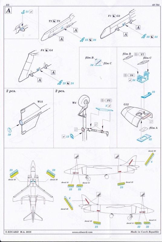 Die messingfarbene Ätzteilplatine beinhaltet Teile für den Cockpitinnenraum, Fahrwerk, Rumpf, Aufhängungspylonen, Head Up Display, Luftbremse (Air Brake) und die am Rumpf befindlichen Antikollisionsstreifen. Auch die seitlichen Schubdüsen des Bausatzes können weiter detailliert werden. Für die Nachbildung der Reflektionsscheibe des Head Up Displays, liegt durchsichtiger Film bei. Eine zweiseitige Verarbeitungsanleitung liegt der Verpackung bei. Aufgrund vieler Kleinteile die es hier zu verarbeiten gilt, sollte man etwas Erfahrung mit Ätzteilen mitbringen und eine Lupe.