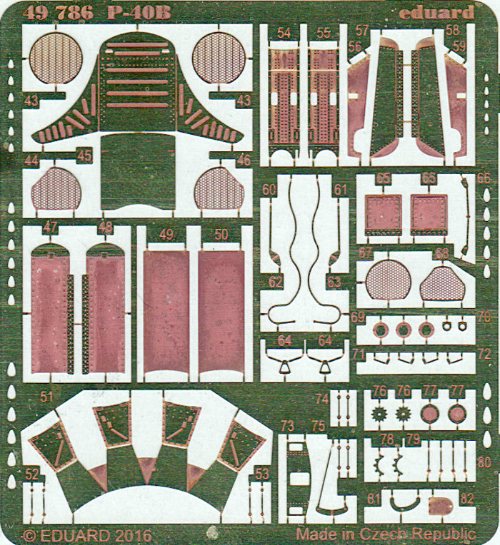 Dieser Detailsatz besteht aus dem farbig bedruckten kleinen Fotoätzteilbogen des Zoom Satzes und einer weiteren unbedruckten Platine. Zusätzlich gibt es für das Cockpit einen Fotoätzteil-Sitz. Der Zusammenbau ist nicht ganz einfach, daher ist dies vielleicht nicht für jeden geeignet... zumal es auch ansehnliche Resinsitze gibt. Am Motorraum gibt es neue Fronten für die Ladereinläufe und Kühlerklappen. Das Fahrwerk bekommt neue Bremsleitungen, einige Details im Fahrwerkschacht und neue Klappen. Letztere müssen natürlich noch in die gewölbte Form gebracht werden. Für die Bauanleitung gilt das bereits beim Zoom Satz gesagte (Bauanleitung). Auch hier fehlen die Gurte! Für diese muss man auf die Steelbelts (es gibt einen Satz für die P-40B und auch generische Sätze mit mehreren Gurtsets) oder die anderen Linien ausweichen. Es scheint aber, dass Eduard auf die Steelbelts setzt, denn in den Fabric und Superfabric Reiehen ist schon länger nichts mehr erschienen.