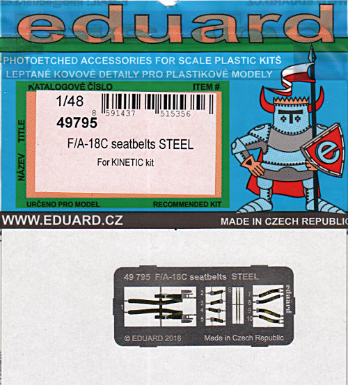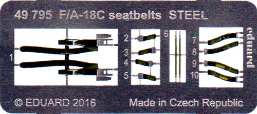 Für den guten Bausatz der F/A-18C von Kinetic (First Look) hat Eduard eine Reihe von Detail und Zubehörsätzen herausgebracht. Den Cockpitsatz gibt es auch diesmal wieder als Zoom Satz, der nur die farbige Platine enthält und als "umfangreicheren" Satz der eine weitere Ätzteilplatine enthält. Dieser Satz enthält die Gurte in der noch relativ jungen Steelbelts Reihe.