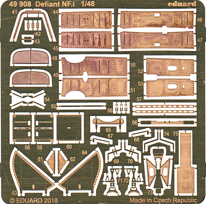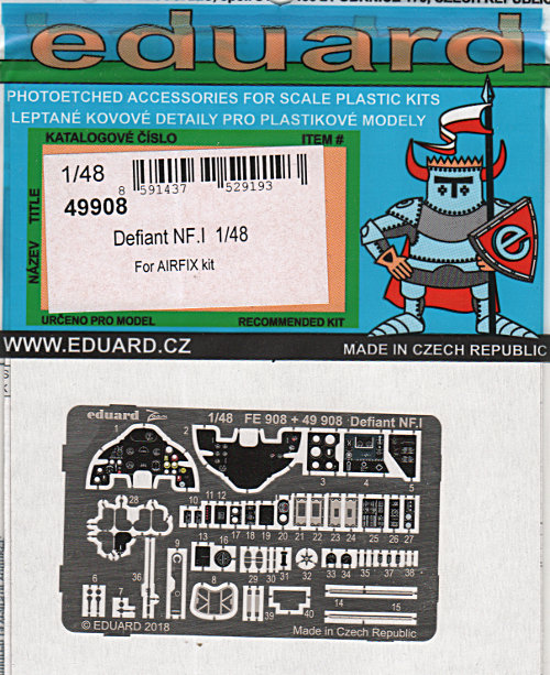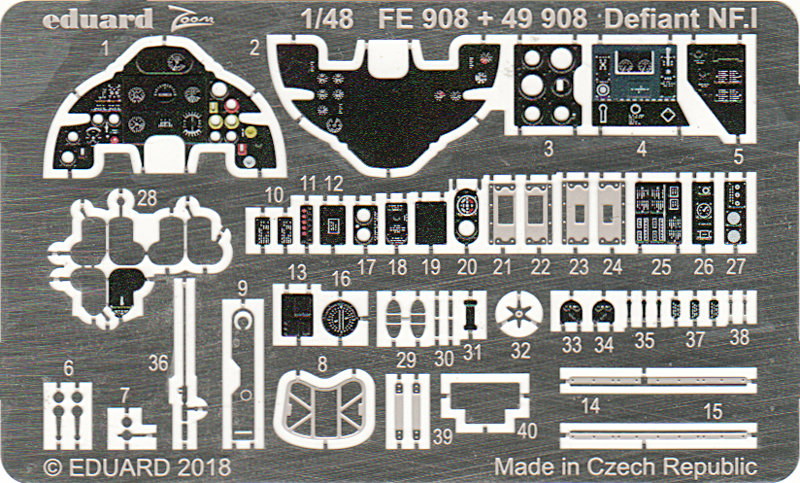 Eduard und Airfix kooperieren ziemlich eng, so dass die tschechische Firma recht frühzeitig Bausätze für die Entwicklung von Zubehörsätzen bekommt. Somit waren die Eduardsätze rechtzeitig zum Erscheinen des Bausatzes im Handel. Für die Boulton Paul Defiant Mk.I (First Look) bietet Eduard drei Fotoätzteilsätze an. Hier stelle ich den aus der farbigen Zoom-Platine (7x4,5cm) und einem klar lackierten PE-Bogen der Größe 7x7cm vor.