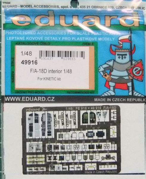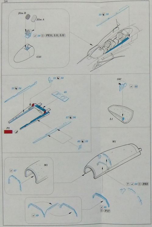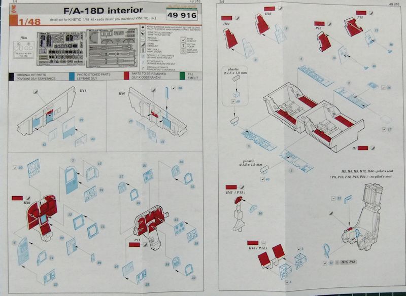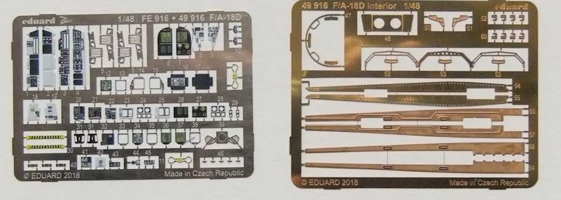 Zwei Platinen sind für den Doppelsitzer der Hornet zu verarbeiten. Eine Platine ist für die Sitze, Konsolen und Armaturenbretter vorgesehen. Die zweite Platine widmet sich der Kabinenhaube der doppelsitzigen Ausführung der Maschine. Rückspiegel, Krallen für den Verschluss der Kanzel und die notwendigen Rahmenteile sind vorhanden.