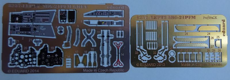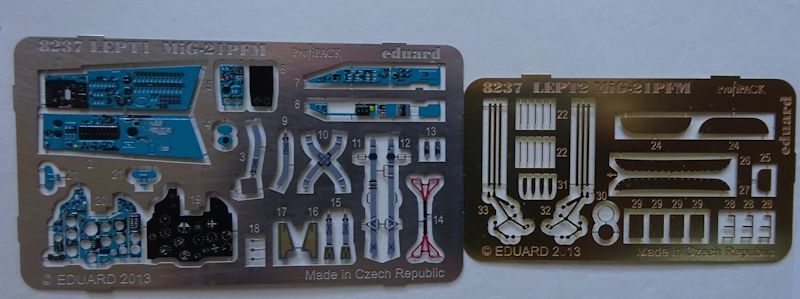 Für seine MiG-21PFM bietet Eduard drei kleine Ätzteilplatinen an. Platine 1 und 3 sind für ein grünes bzw. graues Cockpit gedacht. Neben den Instrumententafeln gibt es Gurte für den Schleudersitz. Platine 2 enthält Teile für Fahrwerk und Rumpf.