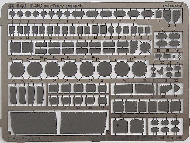 Auch der dritte Satz nimmt die Außendetaillierung der Hawkeye auf's Korn. Diesmal gibt es einen mittelgroßen Bogen mit allerlei Zugangsklappen und Handlochdeckeln für die Oberflächengestaltung der Hawkeye. Diese werden auf die eingravierten Klappen und Paneele aufgeklebt. Die Nietenstruktur unterscheidet ich von den Plastikteilen, daher gehe ich zunächst von einer Korrektur dieser aus (kann dies allerdings nicht nachprüfen, da mir entsprechende Literatur fehlt).