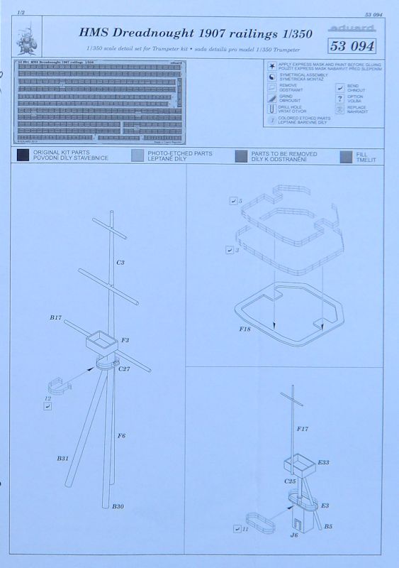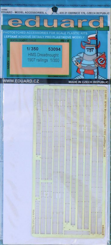 Für die HMS Dreadnought - 1907 von TRUMPETER in 1/350 hat eduard ein Fotoätzteilset mit Teilen für die Reling herausgebracht. Es gibt eine messingfarbene Platine. Hiermit werden die Bausatzteile optimal ergänzt..