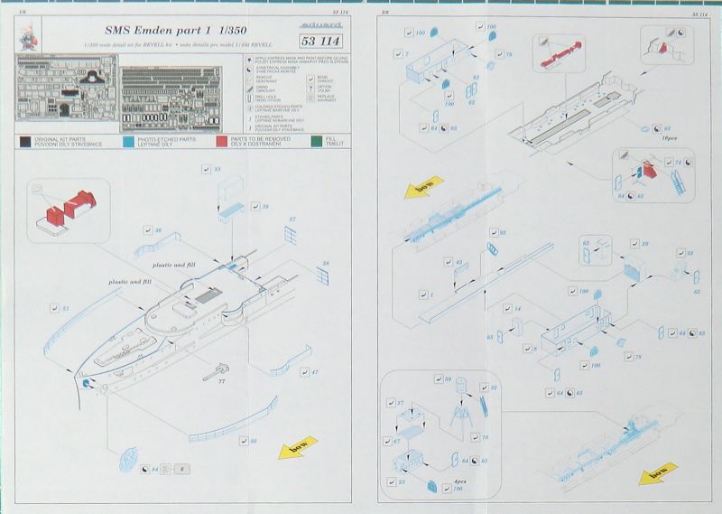 Für den Bausatz der SMS Emden in 1/350 von Revell hat eduard zwei Fotoätzteilsets herausgebracht. Dieses enthält zwei unbedruckte messingfarbene Platinen und die übersichtliche Bauanleitung. Eduard hat hier den Neuaufbau der Relings, vieler Kleinteile und teilweise der Aufbauten. Natürlich werden alle Treppen ersetzt.