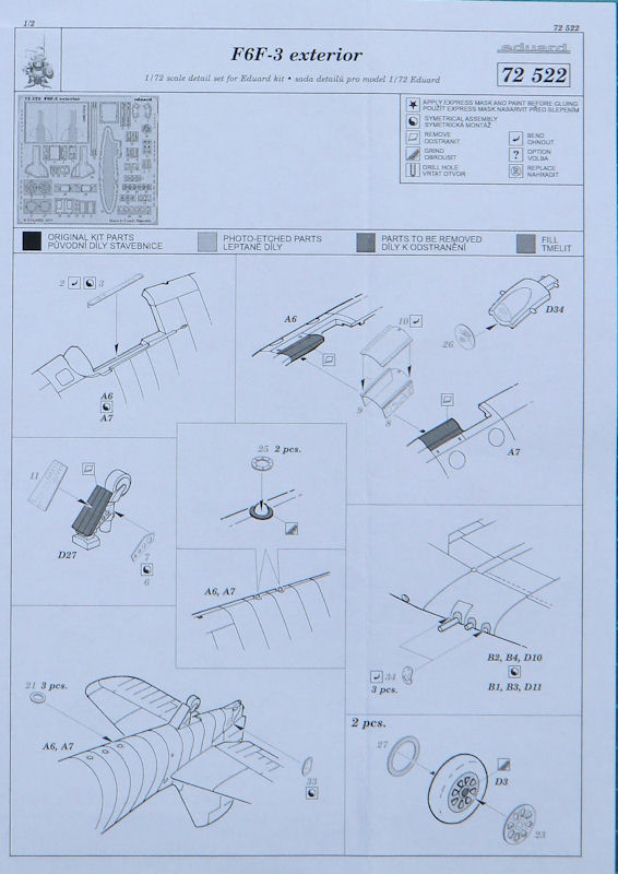 Für den phantastischen eduard-Bausatz der Grumman F6F-3 hat eduard selbst ein Fotoätzteilset für das Äußere der Hellcat herausgebracht. Das Set enthält u.a. ein "Scheibchen" für den Zusatztank(soll dadurch den fehlenden Wulst des Originals darstellen), Teile für die Hauptfahrwerksräder, Abdeckbleche und Fahrwerksklappen nebst Biegehilfe dafür.