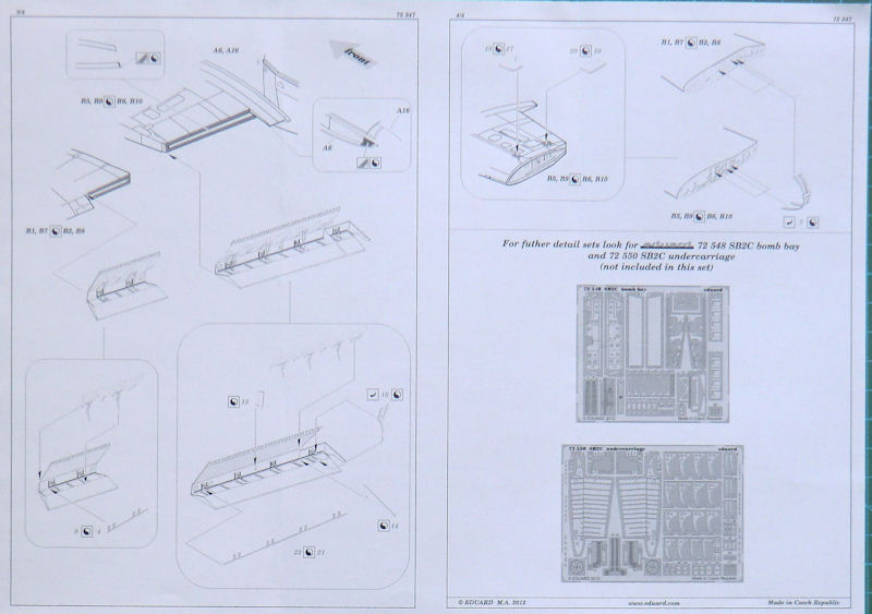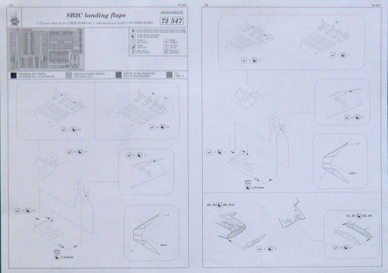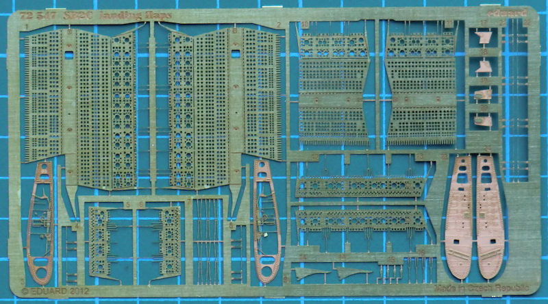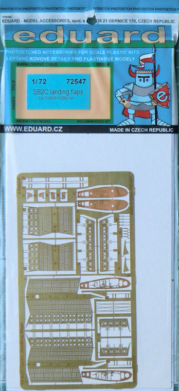 Für die neuen cyber-hobby-Bausätze der Curtiss SB2C Helldiver hat eduard einige Fotoätzteilsets herausgebracht. Dieses ist für die Sturzflugbremsen, die Landeklappen und den Klappflügel. Es gibt eine messingfarbene Platine. Die Fotoätzteile ersetzen die Bausatzteile. Ein wenig muss noch geschnitzt werden. Toll sind die durchbrochenen Stutzflugbremsen.