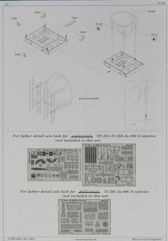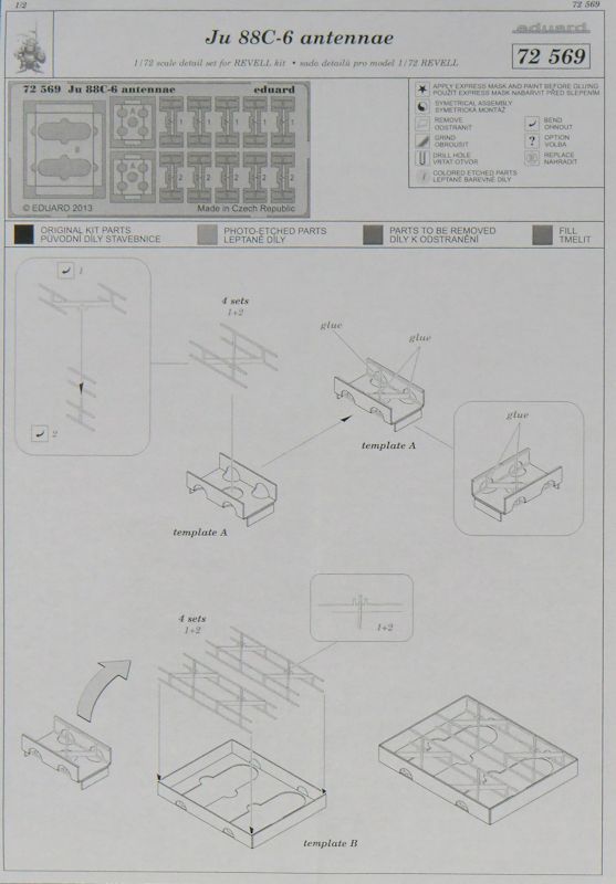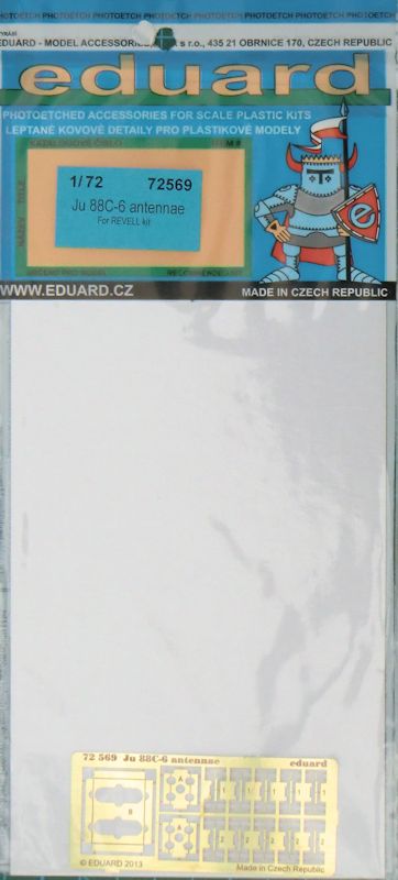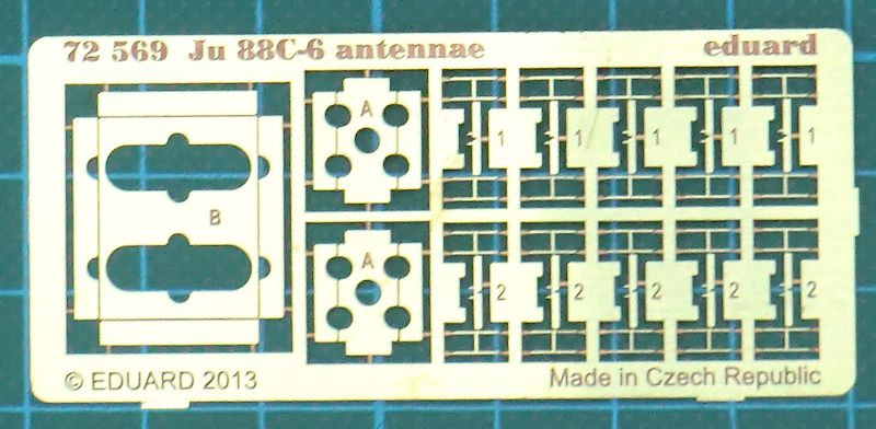 Für den Revell Spritzgussbausatz der Junkers Ju 88C im Maßstab 1/72 hat eduard ein Fotoätzteilset für die Antennen herausgebracht. Es enthält nicht nur die Antennen der Funkmeßgeräte, sondern man hat in der Tschechischen Republik auch überlegt wie man diese zusammenkleben und dann ans restliche Flugzeugmodell montieren kann. Dafür hat eduard ein paar Leeren entwickelt die man sich zuvor zusammenbauen muss. .