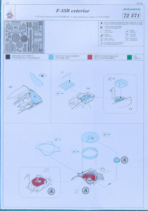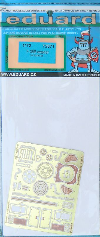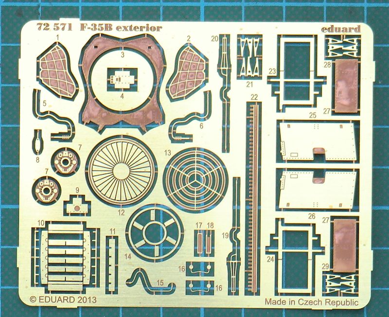 Für den FUJIMI Spritzgussbausatz der F-35B Lightning II im Maßstab 1/72 hat eduard ein Fotoätzteilset für das Äußere herausgebracht. Es enthält sinnvolle Teile für die Detaillierung des Äußere des Bausatzes. So wird der obere Lufteinlauf aufgewertet. Weiterhin gibt es Details für die Schächte. Auch das Fahrwerk wird aufgewertet. So gibt u.a. es Bremsleitungen und Fahrwerksscheren.