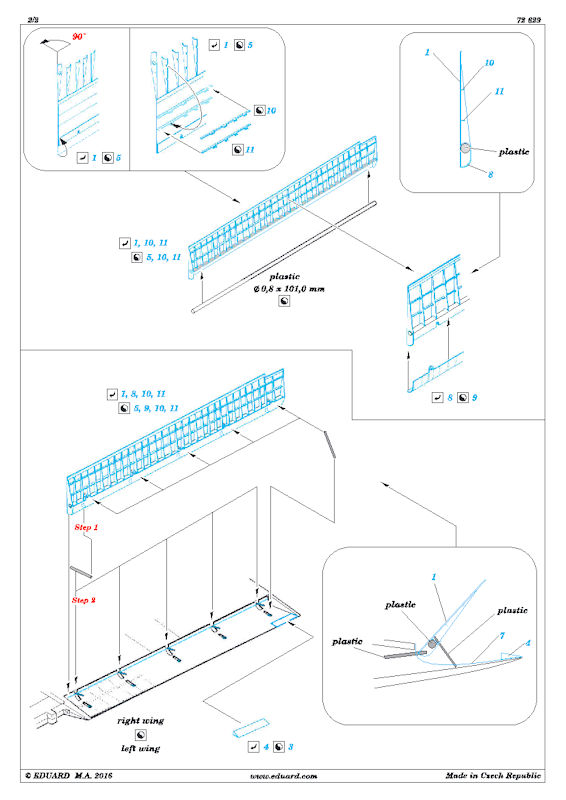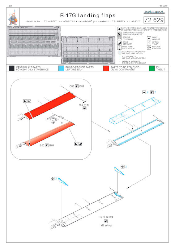 Für den gelungenen Airfix-Bausatz der Boeing B-17G in 1/72 hat eduard ein Landeklappen-Fotoätzteilset herausgebracht. So gibt es hier zwei größere messingfarbene Platinen und die übersichtliche Bauanleitung.