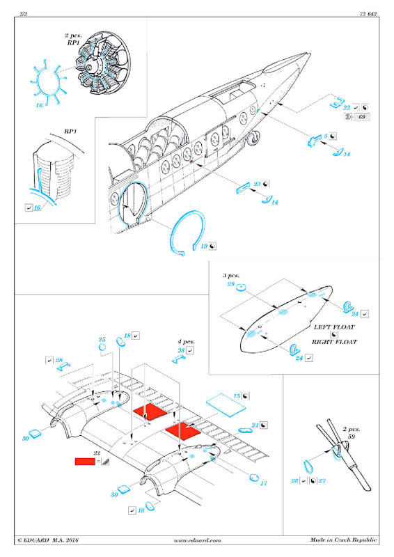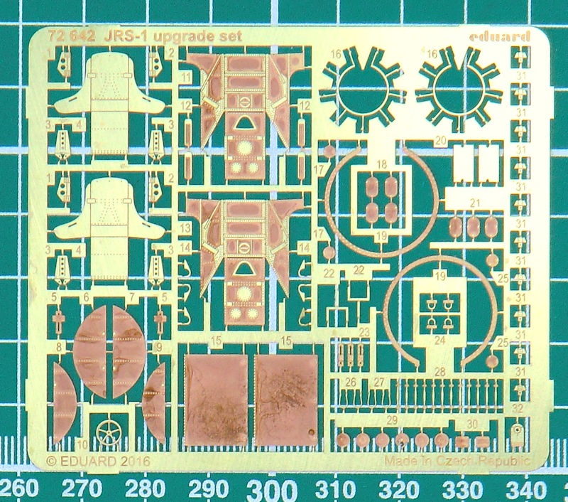 Für den gelungenen Bausatz der Sikorsky JRS hat eduard ein Fotoätzteilset herausgebracht. Es enthält eine messingfarbene Platine und die Bauanleitung. Eduard liefert hier wunderschöne Details für das Innere und Äußere des Bausatzes. So gibt es zwei neue Sitze, diverse Instrumente, weiterhin weitere Kleinteile fürs Cockpit sowie u.a. Teile für den Sternmotor sowie für das Äußere des Bausatzes..