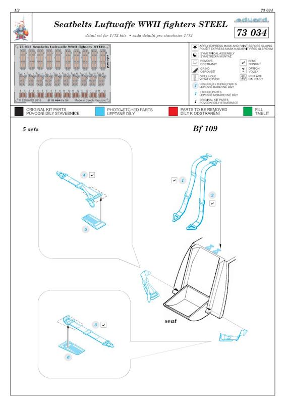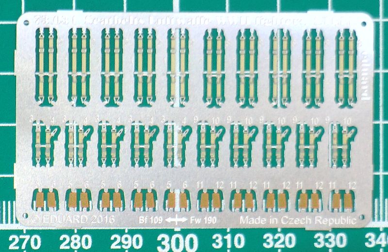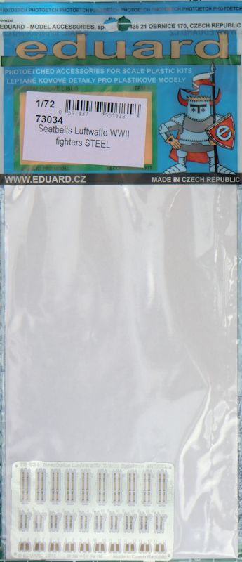Für die Messerschmitt Bf 109 und Focke Wulf Fw 190 im Maßstab 1/72 hat eduard ein neues Set mit Sicherheitsgurten aus Stahl herausgebracht. Diese kann man auch für andere deutsche Flugzeuge aus der Zeit um 1940 verwenden. Das Material ist sehr dünn und die Gurte sind natürlich mehrfarbig bedruckt.