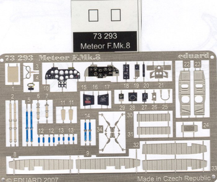 Fotoätzteilset: Eduard hat für die Meteor aus dem Hause der MPM-Gruppe ein sinnvolles Detailset herausgebracht. Damit lässt sich der Bausatz schön aufwerten. So kann der Schleudersitz mit ein paar Sitzgurten verfeinert werden. Für das Instrumentenbrett gibt es auch Ersatz in Form einer bedruckten Variante. Ein paar Teile ergänzen auch die Seitenkonsolen im Cockpit. Auch die Fahrwerkschächte werden noch verfeinert. Wer die Schiebehaube offen montieren möchte, der bekommt dann auch noch einen Griff für deren Innenseite. Insgesamt ist es eine runde Sache, obwohl die Platine die Abmaße eines Zoom-Sets hat.