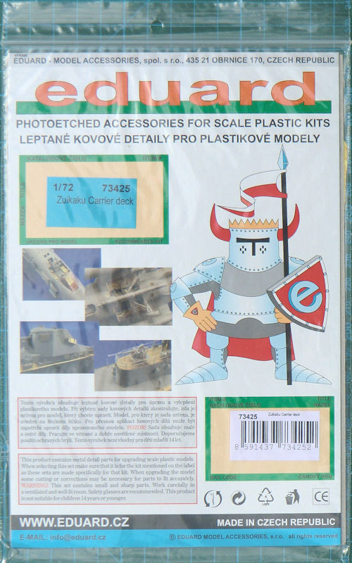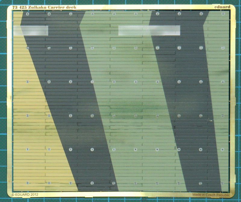Der japanische Träger Zuikaku war von 1941 bis 1944 bei japanischen Marine im Kriegseinsatz. Am 24. Oktober 1944 wurde sie vor Leyte versenkt. Eduard liefert jetzt ein bedrucktes Fotoätzteil welches dem der Zuikaku nachempfunden ist. Es ist im Tarnanstrich realistisch bedruckt. Gedacht ist diese Platte für Modellbauer, die ohne viel Arbeit ihr fertiges Modell passend präsentieren möchten.