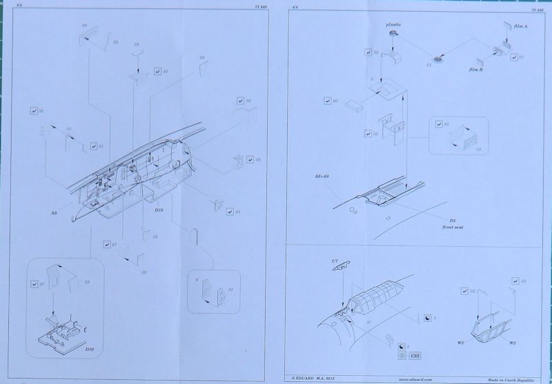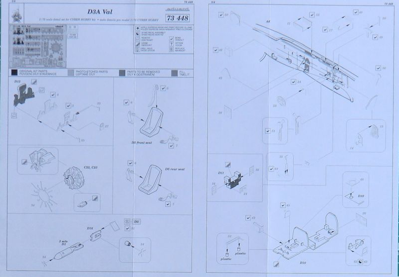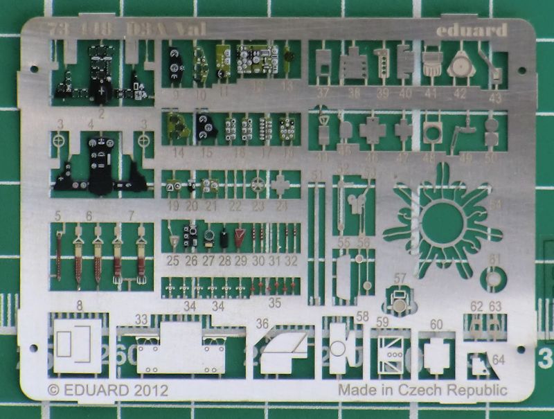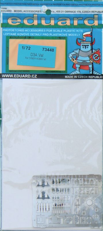 Für die Aichi D3A Val von cyber-hobby in 1/72 hat eduard ein Fotoätzteilset für das Innere und Äußere des Bausatzes herausgebracht. Es enthält eine bedruckte Platine und die übersichtliche Bauanleitung. Mit diesen Teilen kann man u.a. den Sitz mit Gurten versehen. Weiterhin gibt ein neues Instrumentenbrett und weitere Konsolen. Für Außen findet man u.a. diverse Teile für den Motor und die Bewaffnung.