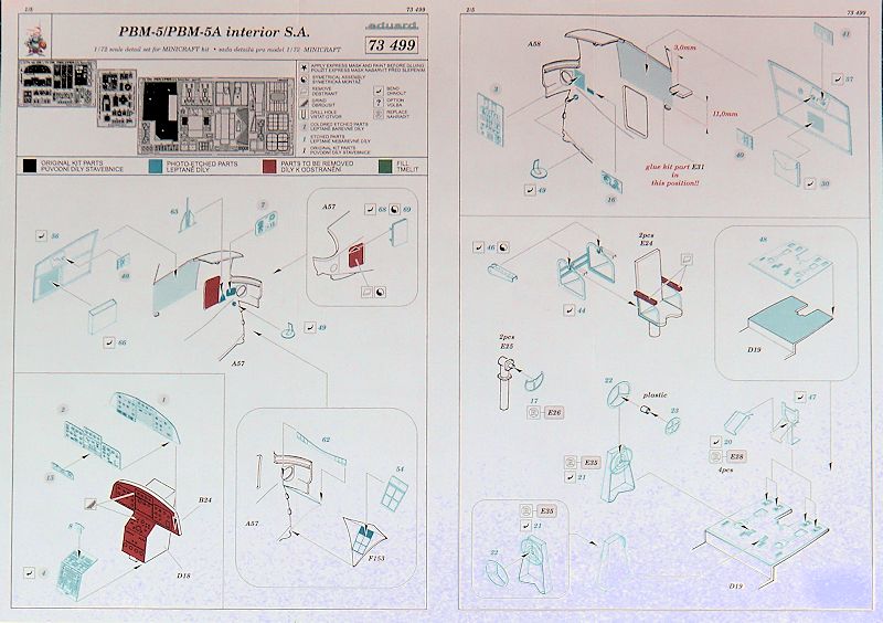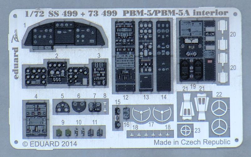 Für die Martin PBM-5/PBM-5A von Minicraft hat eduard einige Fotoätzteilsets herausgebracht. Dieses ist für das Innere des Bausatzes gedacht. Es enthält drei unterschiedlich große Platinen. Zwei davon sind mehrfarbig bedruckt und selbstklebend. Eines fällt allerdings sofort auf: Es fehlen die obligatorischen Sitzgurte. Dafür hat eduard ein separates Set herhausgebracht.