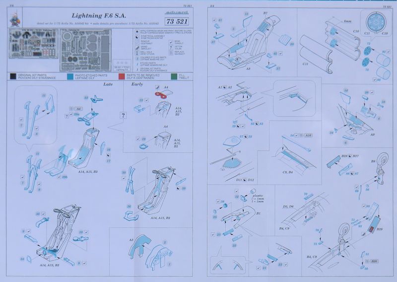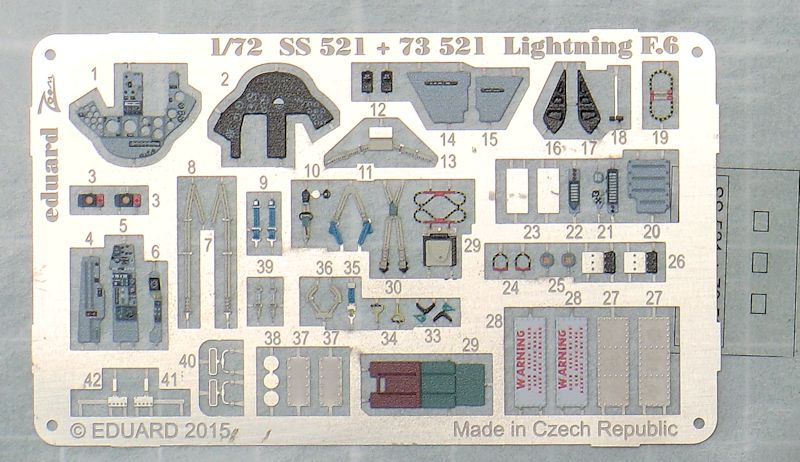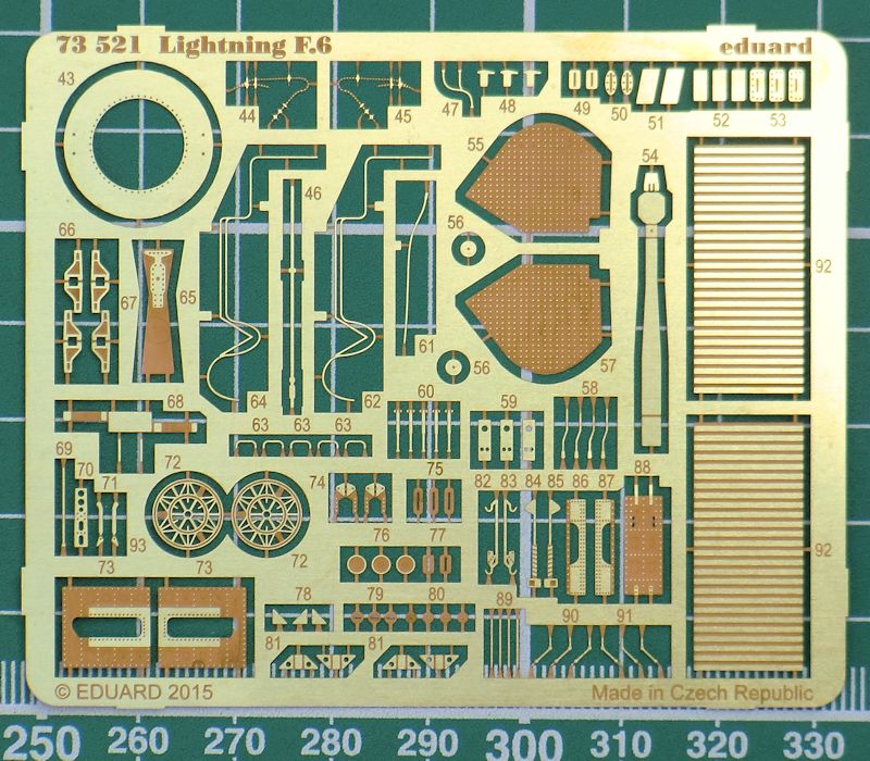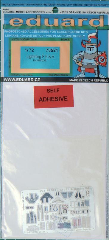 Für die E.E. Lightning F.6 von Airfix in 1/72 hat eduard ein Fotoätzteilset für das Innere und Äußere des Bausatzes herausgebracht. Es enthält jeweils eine bedruckte, eine unbedruckte Platine, einen kleinen Fotofilm und die übersichtliche Bauanleitung. Mit diesen Teilen kann man u.a. den Schleudersitz mit Sitzgurten und Griffen versehen. Weiterhin gibt ein neues Instrumentenbrett und weitere Konsolen. Für Außen findet man u.a. diverse Klappen, Fahrwerksscheren und Teile für die Triebwerksauslässe.