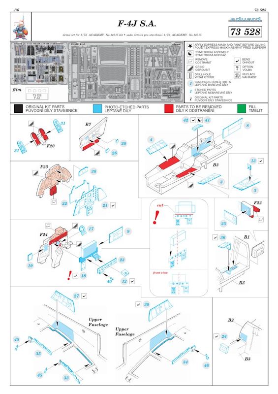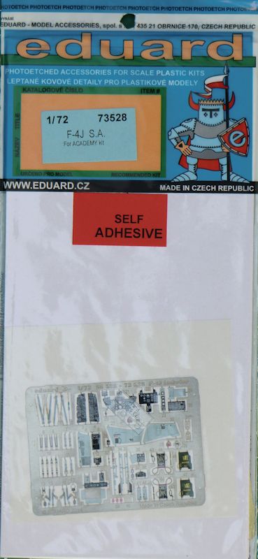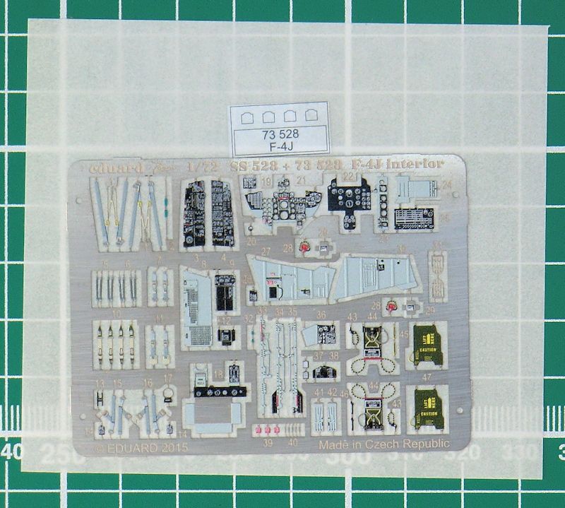 Für den neuen ACADEMY-Bausatz der McDonnell Douglas F-4J Phantom II hat eduard neben dem ZOOM-Fotoätzteilset ein größeres Detailset für den Bausatz herausgebracht. Es enthält ein kleine mehrfarbig bedruckte Platine, eine messingfarbene Platine, einen kleinen Fotofilm und die übersichtliche Bauanleitung. Eduard hat an die obligatorischen mehrfarbigen Sitzgurte für die Schleudersitze und an die Instrumente fürs Cockpit gedacht. Weiterhin gibt es weitere Details fürs Cockpit.