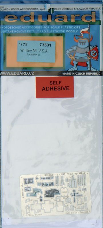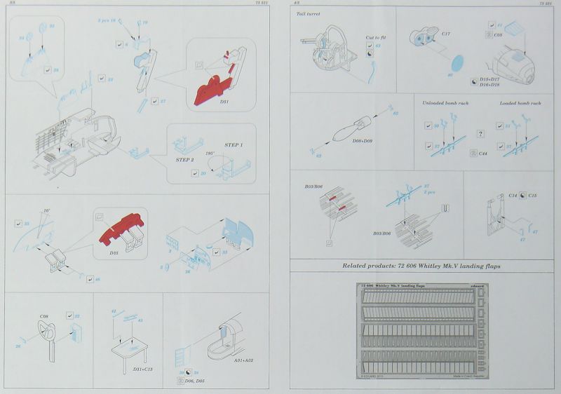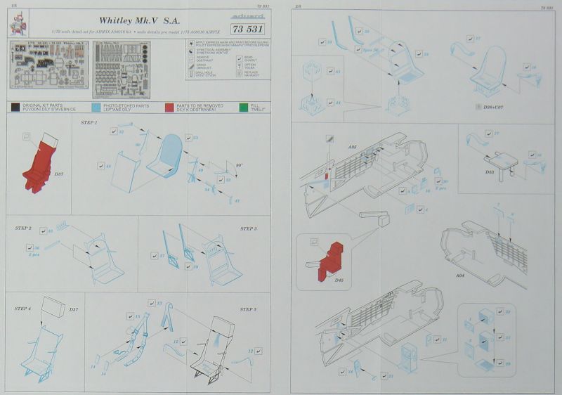 Für den neuen Bausatz der Armstrong Whitworth Whitley Mk. V von Airfix hat eduard neben dem ZOOM-Fotoätzteilset ein größeres Detailset für den Bausatz herausgebracht. Es enthält ein kleine mehrfarbig bedruckte Platine, eine messingfarbene Platine und die übersichtliche Bauanleitung. Eduard hat an die obligatorischen mehrfarbigen Sitzgurte und an die wundervollen Instrumente fürs Cockpit gedacht. Weiterhin gibt es weitere Details fürs Cockpit. Einen im Bausatz vorhanden Sitz soll man zersägen um ein winziges Teilchen noch zu verbauen. Hier hätte ich mir eine einfachere Lösung gewünscht.