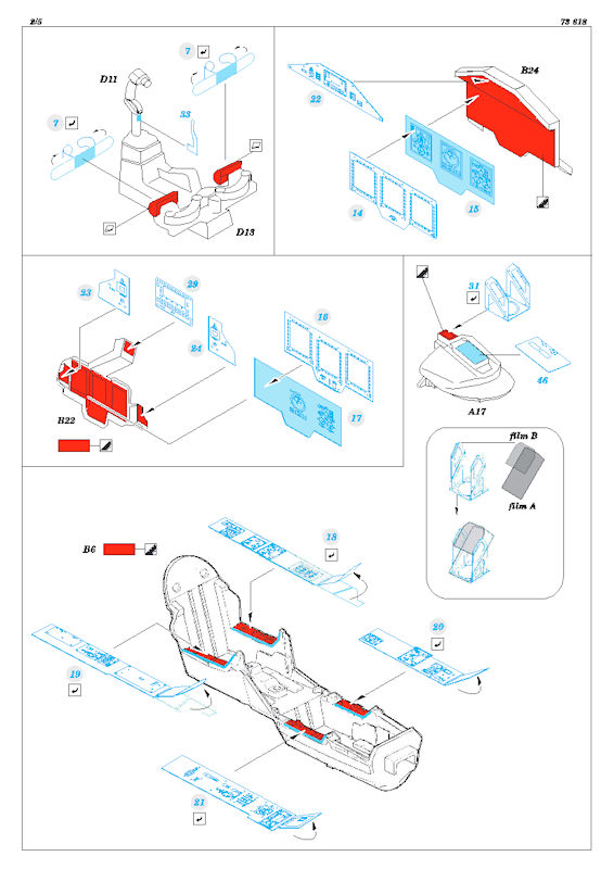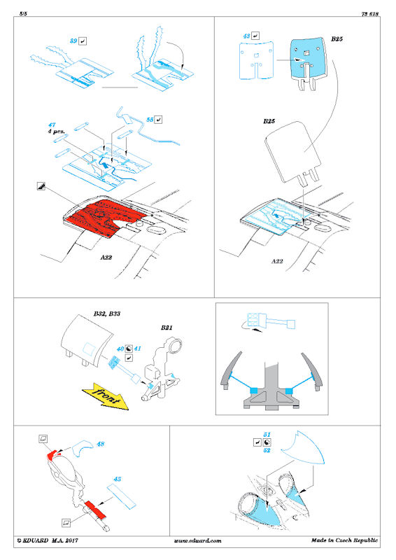 Für den gelungenen Bausatz der Jakowlew Jak-130 hat eduard u.a. ein Fotoätzteilset herausgebracht. Es enthält neben dem kleinen Fotofilm jeweils eine kleine vernickelte und messingfarbene Platine sowie die übersichtliche Bauanleitung. Eduard liefert hier wunderschöne Details für das Innere und Äußere des Bausatzes. So gibt es Gurte für den Schleudersitz, neue Seitenruderpedale, Details für die Headupdisplays sowie weitere Kleinteile fürs Cockpit. Die Klarsichthaube bekommt auch ein paar neue Details.