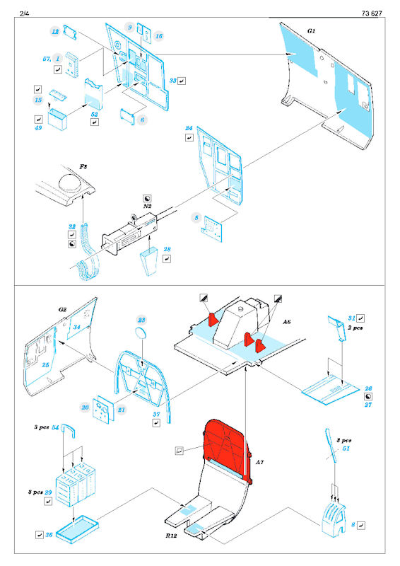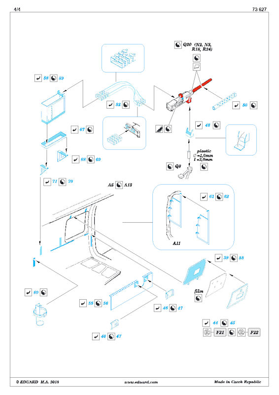 Für den gelungenen durch eduard mit Zusatzteilen versehenen Bausatz der Liberator GR Mk. V hat eduard ein Fotoätzteilset herausgebracht. Es enthält ein kleine mehrfarbig bedruckte sowie eine messingfarbene Platine und die Bauanleitung. Eduard liefert hier wunderschöne Details für das Innere des Bausatzes. So gibt es Teile für den Pilotensitz, Seitenruderpedale, weiterhin weitere Kleinteile fürs Cockpit sowie u.a. Teile für die Rumpfseiten, MG-Gurte, neue Läufe für die Kaliber .50 MGs..
