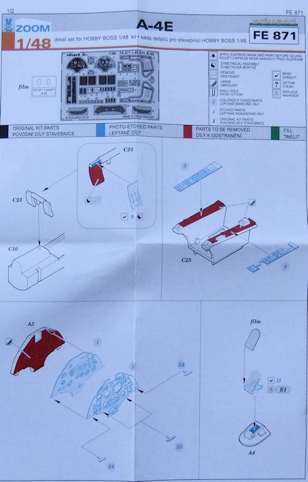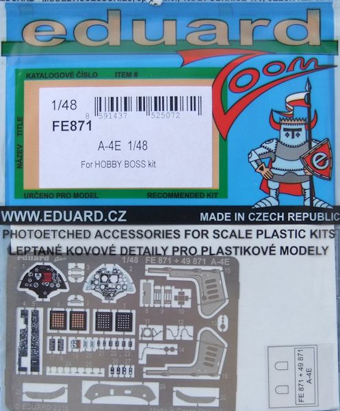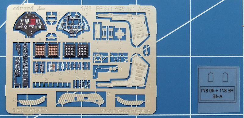 Vorwiegend für das Cockpit der Douglas A-4E Skyhawk ist dieses Ätzteile-Set gedacht. Neben Teilen, wie Instrumententafel in Sandwichbauweise und neuen Seitenkonsolen, gibt es auch Teile um die Außenfläche des Escapac Schleudersitzes zu verfeinern. Und dann wäre noch die schön detaillierte Visieranlage, mit einem Film zu deren Optimierung zu erwähnen.