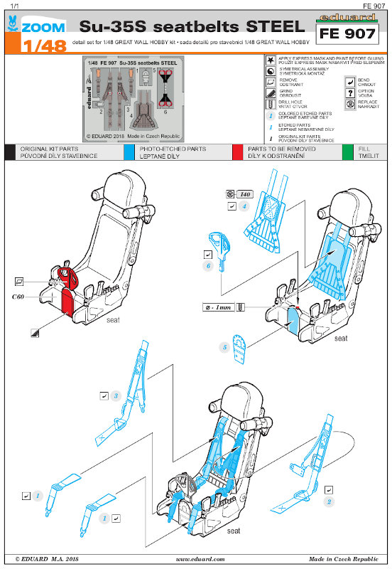 Für die Suchoi Su-35S von Great Wall Hobby (First Look) hat Eduard eine Reihe von Detail- und Zubehörsätzen herausgebracht. Inzwischen ist es usus, dass die Gurte nicht mehr den Detailsätzen beiliegen, sondern extra erworben werden müssen. Mir gefällt dies nicht, aber das ist halt das Geschäft von Eduard und es spült den Mannen in Obrnice Geld in die Kasse.