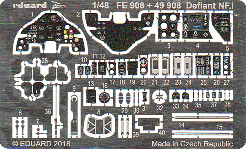 Eduard und Airfix kooperieren ziemlich eng, so dass die tschechische Firma recht frühzeitig Bausätze für die Entwicklung von Zubehörsätzen bekommt. Somit waren die Eduardsätze rechtzeitig zum Erscheinen des Bausatzes im Handel. Für die Boulton Paul Defiant Mk.I (First Look) bietet Eduard drei Fotoätzteilsätze an. Hier stelle ich die farbige Zoom-Platine (7x4,5cm) vor.