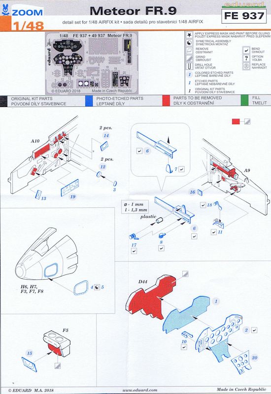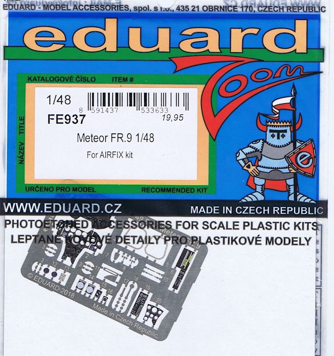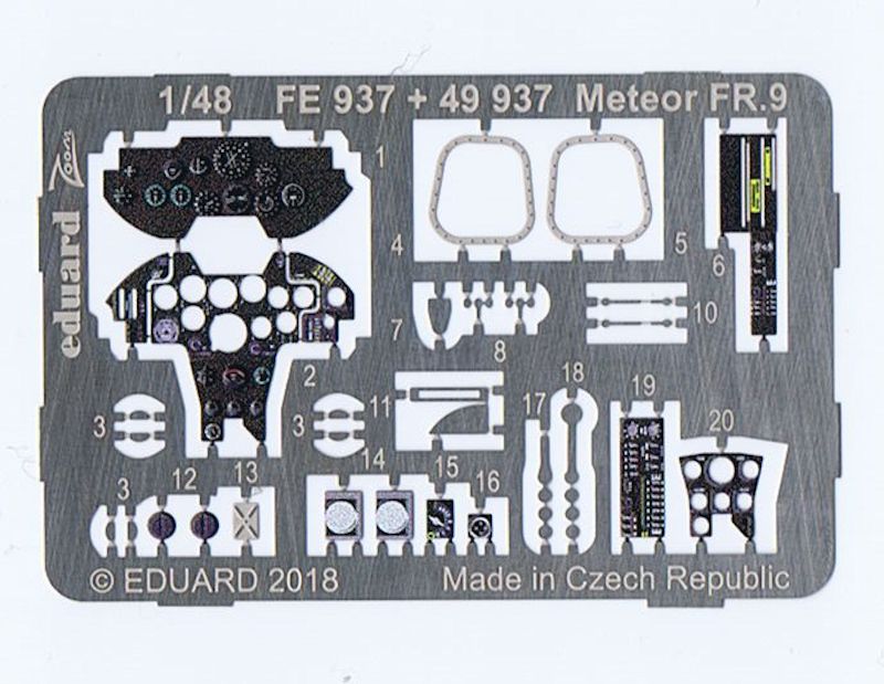 Passend zur gerade erschienenen Gloster Meteor Fr.9 von Airfix bringt Eduard ein abgespecktes Fotoätzteilset für den Innenraum auf den Markt. Es beinhaltet lediglich die Platine für das Cockpit, die Fensterrahmen für die Bugnase und eine einseitig bedruckte Verarbeitungsanleitung. Mit diesen Teilen lassen sich das Cockpit und die Nase aufwerten.