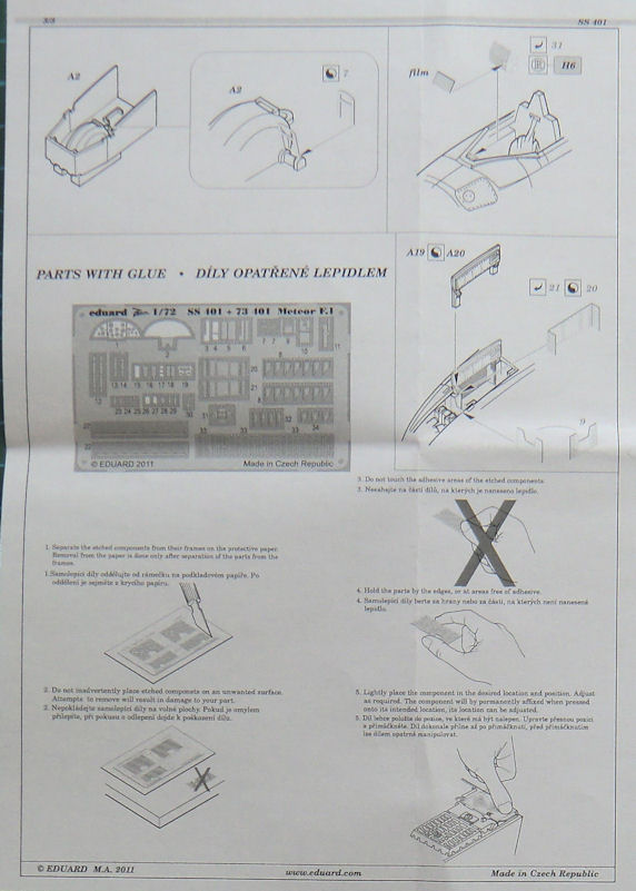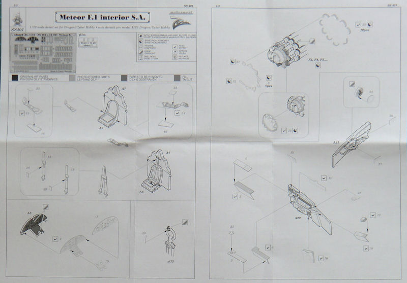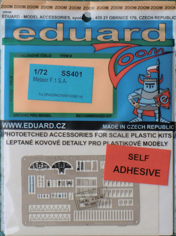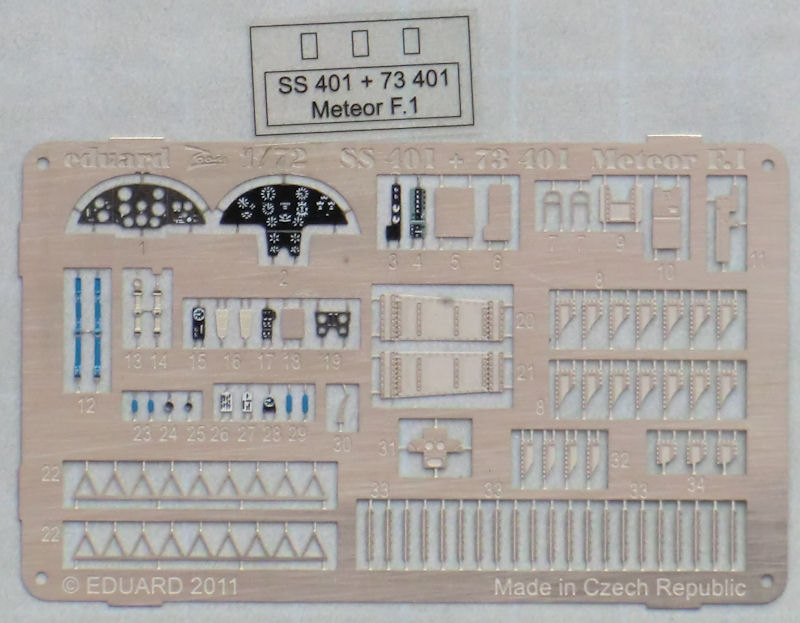 Für den gelungenen cyber-hobby Bausatz der Gloster Meteor F.1 hat eduard ein Fotoätzteilset(Zoom) für die inneren Details herausgebracht. Es enthält einen bedruckten Bogen und einen kleinen Fotofilm für das Visier. Mit den beiliegenden Teilen können u.a. die Kabine(u.a. Mit bedruckten Sitzgurten), Fahrwerksschächte und die Klappen verfeinert werden. Natürlich gibt es auch ein bedrucktes Instrumentenbrett