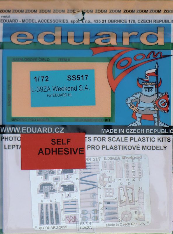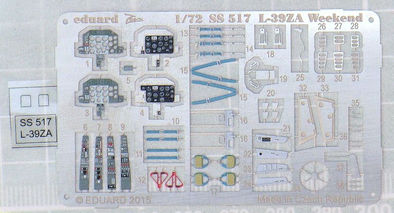 Für den Weekend-Bausatz der L-39ZA Albatros hat eduard ein ZOOM-Fotoätzteilset für den Bausatz herausgebracht. Es enthält ein kleine mehrfarbig bedruckte Platine, einen kleinen Fotofilm und die übersichtliche Bauanleitung. Eduard hat an die obligatorischen mehrfarbige Sitzgurte und Instrumente fürs Cockpt gedacht. Weiterhin gibt es Details fürs Fahrwerk, die Antennen und den Waffenbehälter.